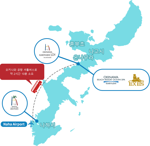 카리유시 호텔은 오키나와 본섬의 북부와 남부에 점재하고 있으며, 온나손(북부)에는 OKINAWA KARIYUSHI RESORT EXES ONNA, OKINAWA KARIYUSHI BEACH RESORT OCEAN SPA, OKINAWA KARIYUSHI LCH. RESORT on The Beach가 있으며, 나하시( 남부)에 OKINAWA KARIYUSHI LCH. 2nd가 있습니다.