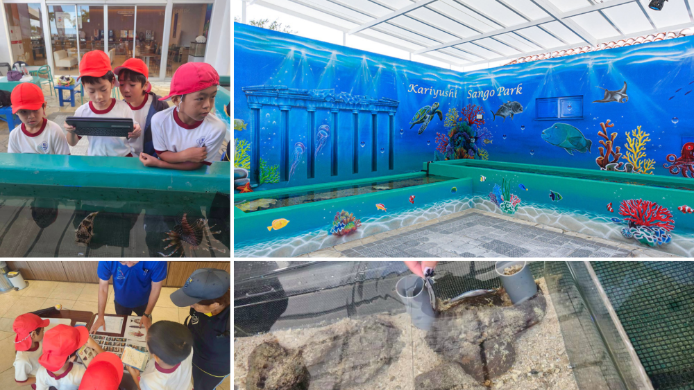 講習の後は、サンゴパークへ移動!タッチプールで可愛いお魚やナマコと触れ合ったり、実際にオニダルマオコゼやミノカサゴを観察したり。図鑑で見るのとは違う、本物の迫力に、子どもたちは興味津々の様子でした。